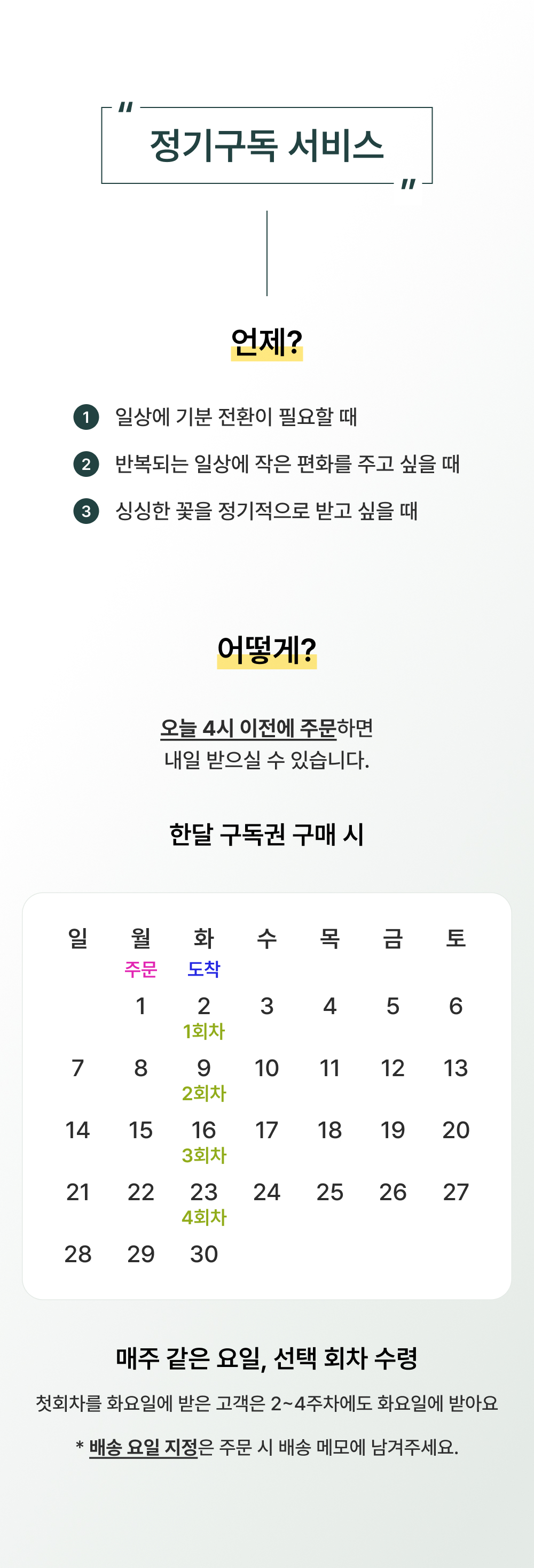 제철에 맞는 신선한 꽃으로 전문 플로리스트가 디자인해서 보내드려요. 당신이 머무는 공간이 꽃향기로 채워질 거에요!