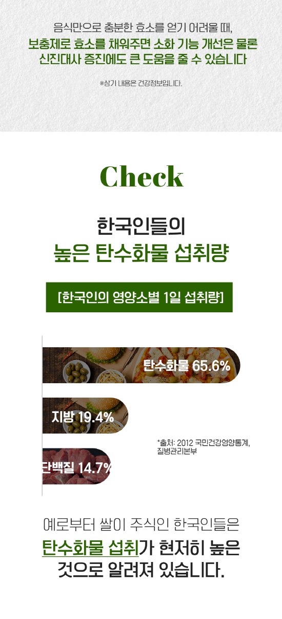 1포(3g)당 12 kcal 나트륨 7mg 0% 당류 1g 1% 트랜스지방 0g 콜레스테롤 0mg 0% 탄수화물 2g 1% 지방 0g 0% 포화지방 0g 0% 단백질 1g 1% 1일 영양성분 기준치에 대한 비율(%)은, 2,000kcal 기준이므로 개인의 필요 열량에 따라 다를 수 있습니다.