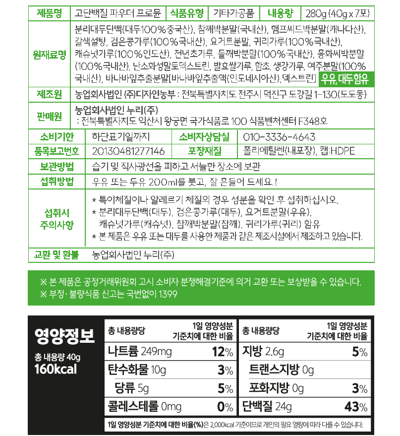 분리대두단백, 참깨박 분말, 햄프씨드박 분말, 갈색설탕, 검은콩가루, 요거트분말, 귀리가루, 캐슈넛가루, 천년초가루, 들깨박 분말, 홍화씨박 분말,난소화성말토덱스트린, 발효 쌀가루, 함초, 생강 가루, 여주 분말, 바나바잎추출분말