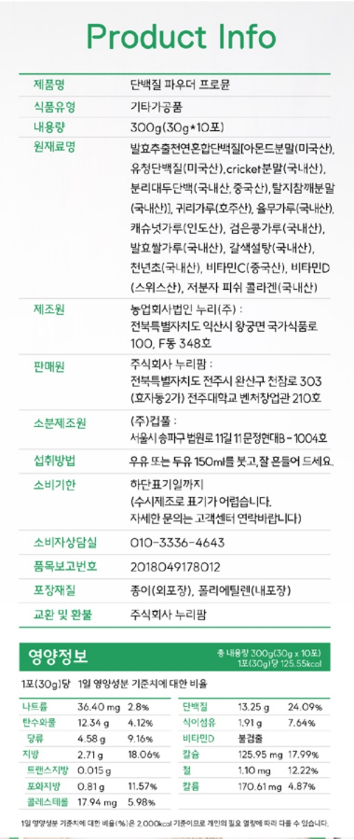 발효추출천연혼합단백질(아몬드분말, 유청단백질, cricket분말, 분리대두단백, 탈지참깨분말), 귀리가루, 율무가루, 캐슈넛가루, 검은콩가루, 발효쌀가루,. 갈색설탕, 천년초, 저분자피쉬콜라겐, 비타민C, 비타민D