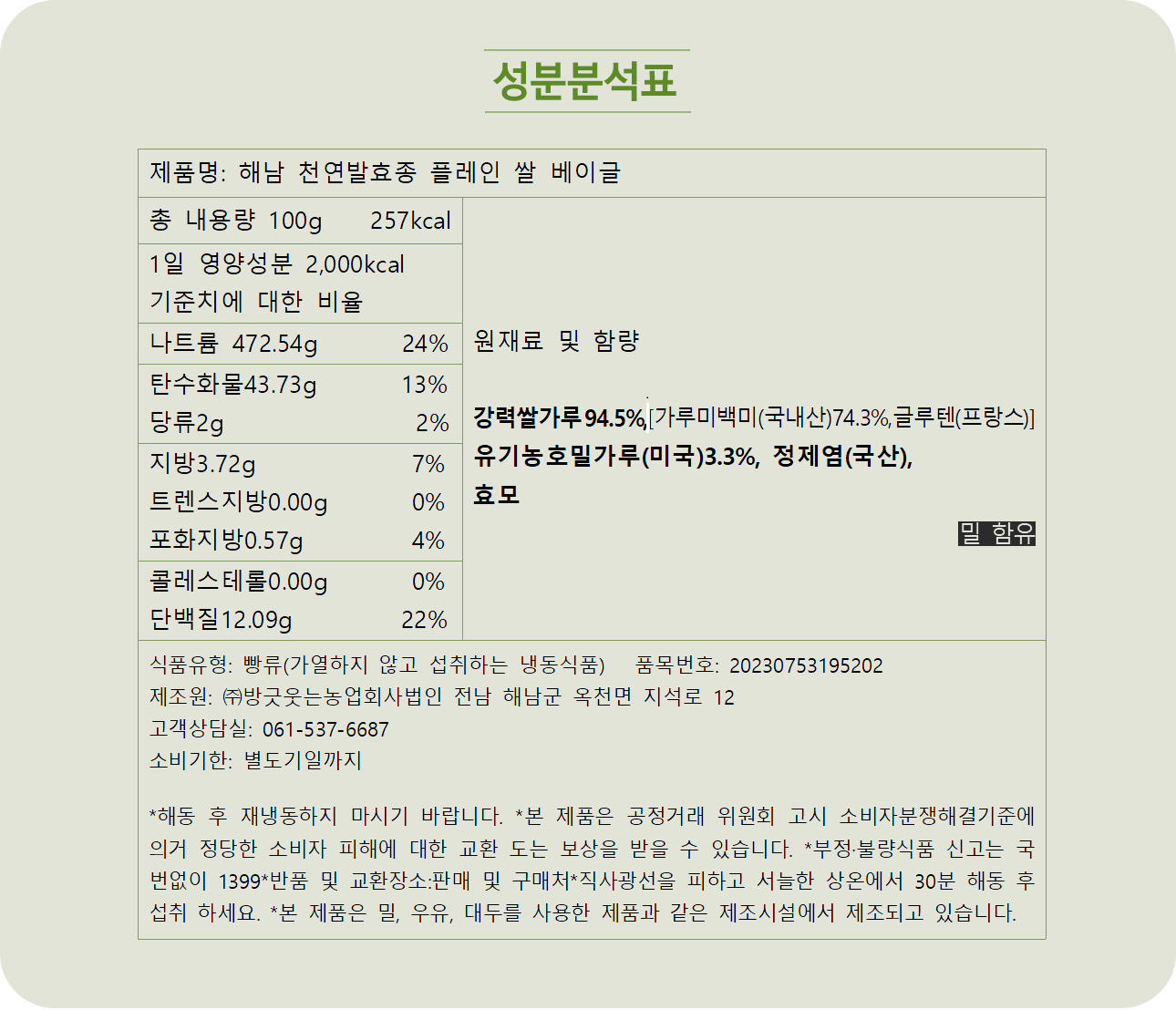 국내산100% 쌀로 만든 국내 제작 강력가루쌀과 원물, 발효종 소금으로만 암 환우가 개발하여 만든 소화가 잘 되는 고단백 건강한 베이글입니다.