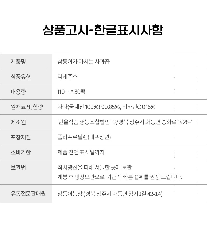 영양정보 (총내용량110ml,60kcal) , 1일영양성분 기준치에 대한 비율 나트륨17mg(1%), 탄수화물 15g(4%), 당류12g(12%), 콜레스테롤 0mg(0%), 지방0g (0%), 트랜스지방0g(0%), 포화지방0g(0%), 단백질0g(0%)