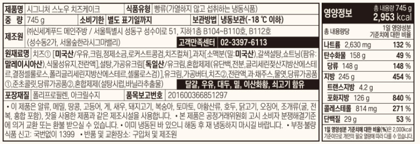 • 베키아에누보 시그니처 스노우 치즈 케이크(745g/냉동)