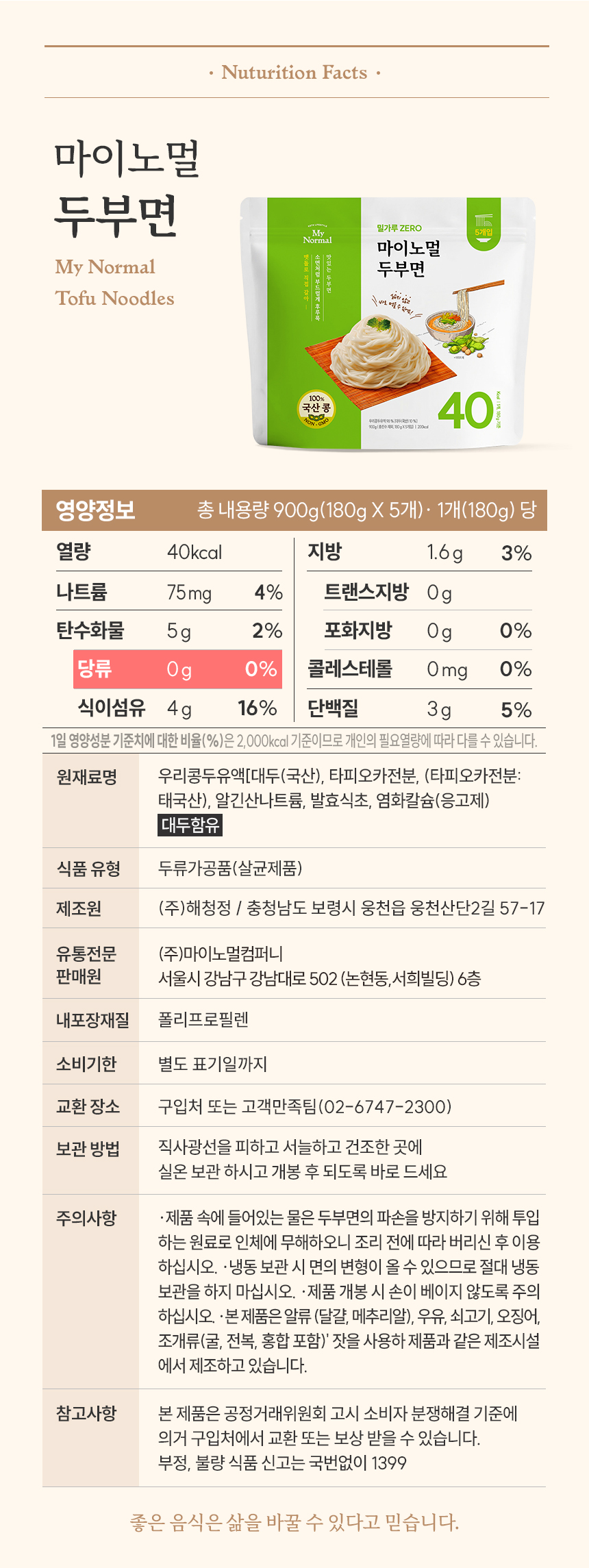 마이노멀 두부면으로 건강한 면 요리를 만들어 보세요! 1. 한 봉 다 먹어도 40kcal 2. 밀가루 없이도 끊김없이 부드러운 소면 식감 3. 삶거나 헹굴 필요없이 바로 섭취 가능 4. NON-GMO 100% 국산콩으로 만들어 글루텐프리! 5. 살균 처리되어 편하게 실온 보관 가능