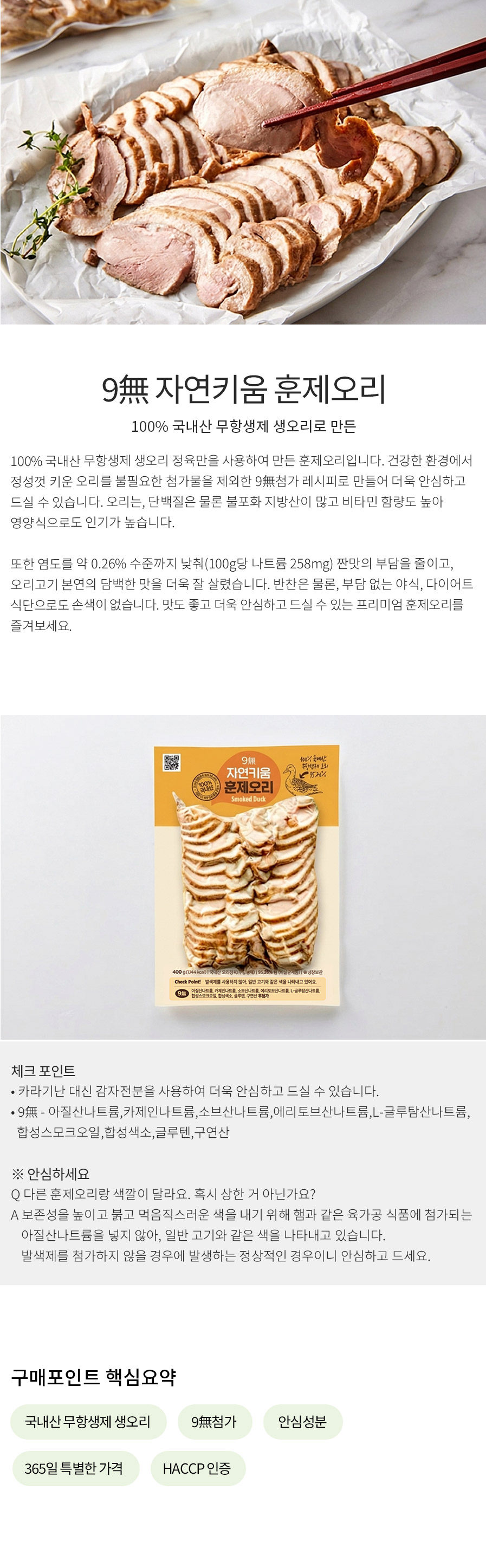 염도 0.258%! 100% 국내산 무항생제 생오리로 만든 짜지 않은 훈제오리