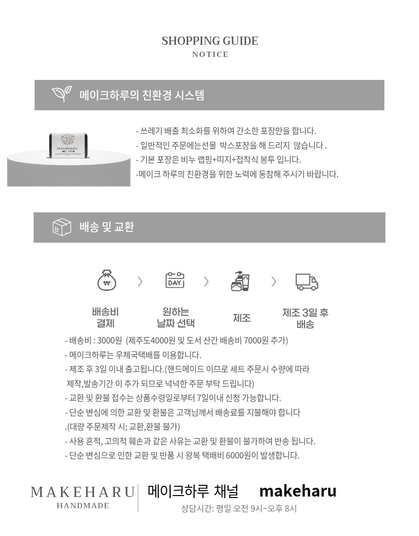 *화장품 사용 중 또는 사용 후 사용부위나 주변에 붉은 반점 , 부어오름 또는 가려움증 등의 이상 증상이나 부작용 등이 있으실 경우 즉시 사용을 중지 하시고 전문의와 상담 부탁 드립니다. *상처가 있는 부위나 알레르기가 있으신 분은 사용을 자제헤 주시기 부탁 드립니다. *눙에 들어갔을 경우에는 흐르는 물로 즉시 씻어 내 주시기 바랍니다. *유아및 소아 그리고 애완견의 손에 닫지 않게 보관 부탁 드립니다. *직사 광선을 피해 보관 부탁 드립니다. *습하지 않은 시원하고 서늘한 햇볕이 없는 곳에 보관 부탁 드립니다. 간혹 습한 경우 물방울 등이 맺힐수 있으나 이는 습기를 끌어당기는 자연스러운 현상이므로 제거 후 사용 하시면 됩니다. *비누사용 후 반드시 물이 잘 빠지는 곳에서 제품이 무르지 않게 잘 건조하시면서 사용 부탁 드립니다. *보관은 절대 습기가 많은 냉장고속은 불가 합니다 (시원하고 서늘한 곳에 보관) *사용기간은 포장을 뜯지 않고 직사광선과 뜨거운 곳을 피해 보관시 제조일로 부터 약 18개월 입니다. *단순반품이나 교환시 포장을 뜯지 않고 받은 그대로 보내주셔야 단순반품,교환 가능 합니다(받으신 날 로 부터 7일 이내) *단순반품,교환시는 왕복 택배비가 부과 됩니다. *제주도,도서산간 추가 택배비 있습니다 (각 4000원, 7000원 추가)