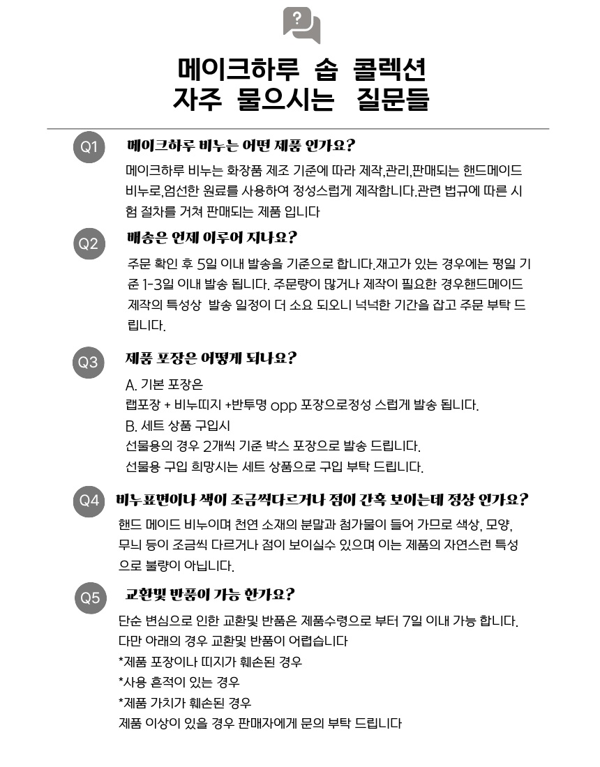 *화장품 사용 중 또는 사용 후 사용부위나 주변에 붉은 반점 , 부어오름 또는 가려움증 등의 이상 증상이나 부작용 등이 있으실 경우 즉시 사용을 중지 하시고 전문의와 상담 부탁 드립니다. *상처가 있는 부위나 알레르기가 있으신 분은 사용을 자제헤 주시기 부탁 드립니다. *눙에 들어갔을 경우에는 흐르는 물로 즉시 씻어 내 주시기 바랍니다. *유아및 소아 그리고 애완견의 손에 닫지 않게 보관 부탁 드립니다. *직사 광선을 피해 보관 부탁 드립니다. *습하지 않은 시원하고 서늘한 햇볕이 없는 곳에 보관 부탁 드립니다. 간혹 습한 경우 물방울 등이 맺힐수 있으나 이는 습기를 끌어당기는 자연스러운 현상이므로 제거 후 사용 하시면 됩니다. *비누사용 후 반드시 물이 잘 빠지는 곳에서 제품이 무르지 않게 잘 건조하시면서 사용 부탁 드립니다. *보관은 절대 습기가 많은 냉장고속은 불가 합니다 (시원하고 서늘한 곳에 보관) *사용기간은 포장을 뜯지 않고 직사광선과 뜨거운 곳을 피해 보관시 제조일로 부터 약 18개월 입니다. *단순반품이나 교환시 포장을 뜯지 않고 받은 그대로 보내주셔야 단순반품,교환 가능 합니다(받으신 날 로 부터 7일 이내) *단순반품,교환시는 왕복 택배비가 부과 됩니다. *제주도,도서산간 추가 택배비 있습니다 (각 4000원, 7000원 추가)