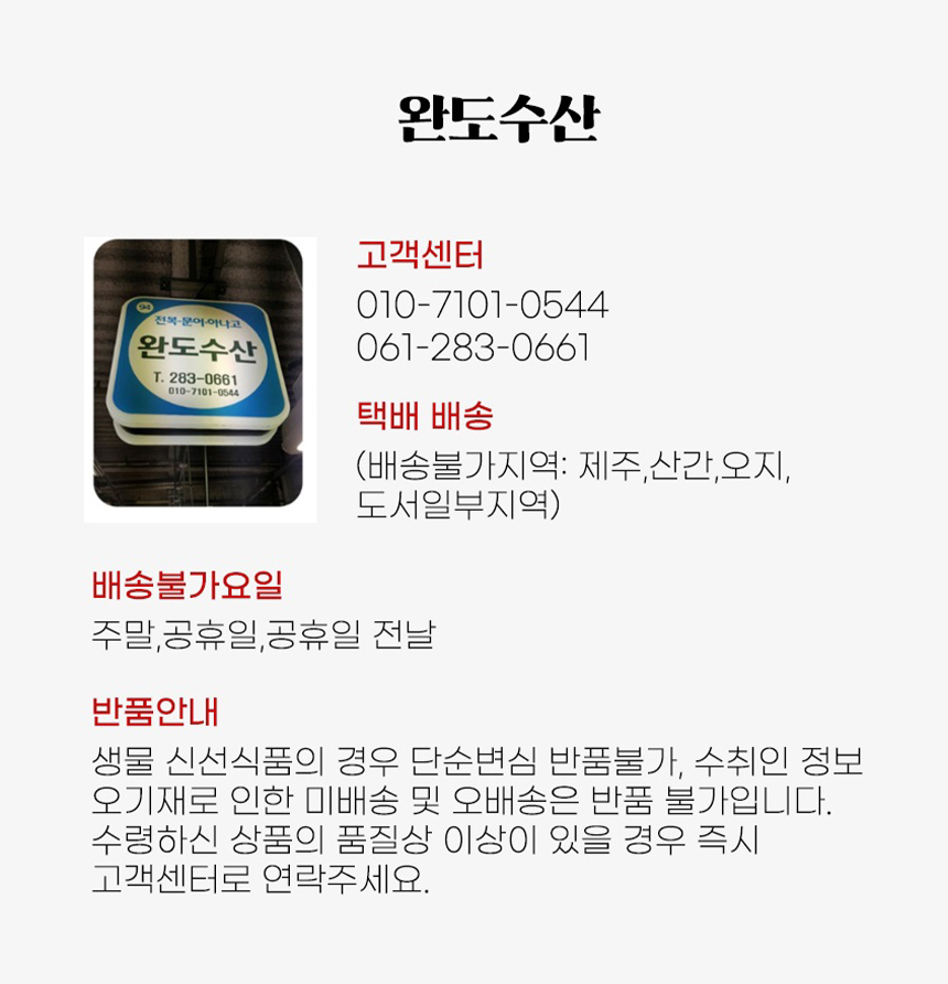 1. 저희 완도수산은 섬지역 제주도 지역은 택배 발송 불가입니다.