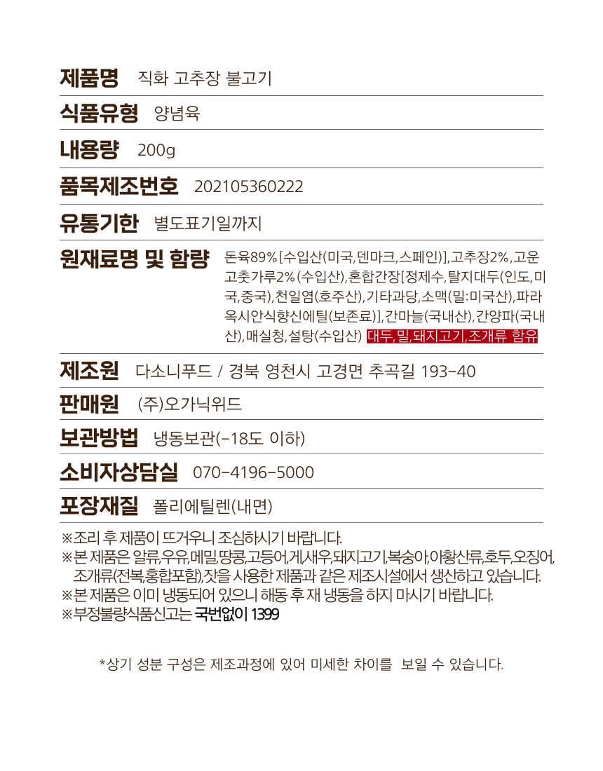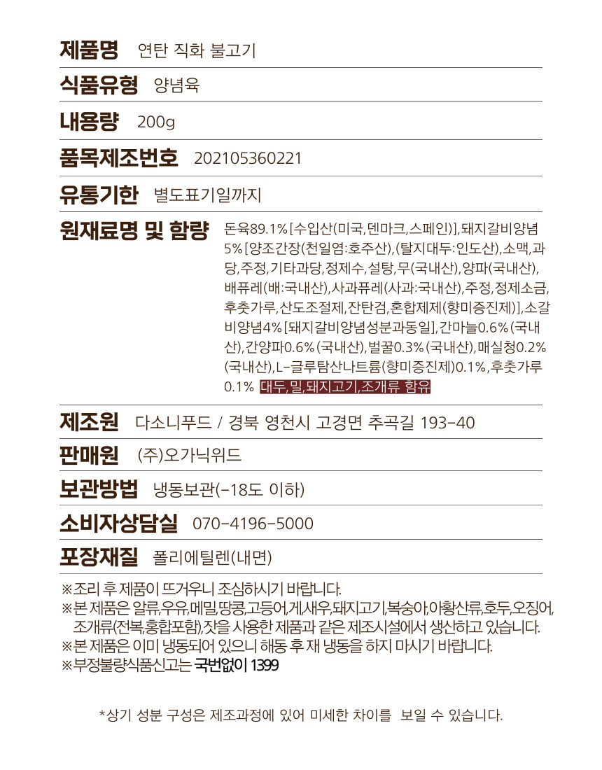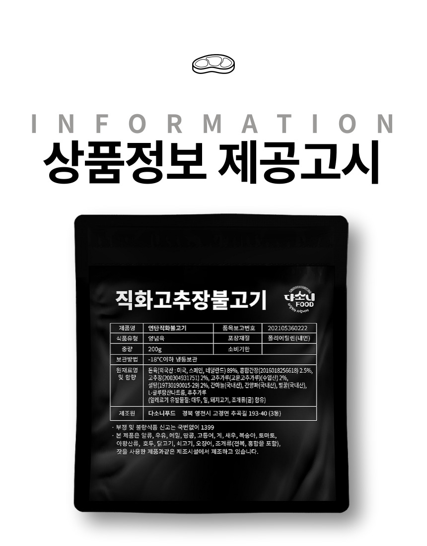 • 다소니푸드 HMR 직화 가열 밀키트 연탄 불고기 200g