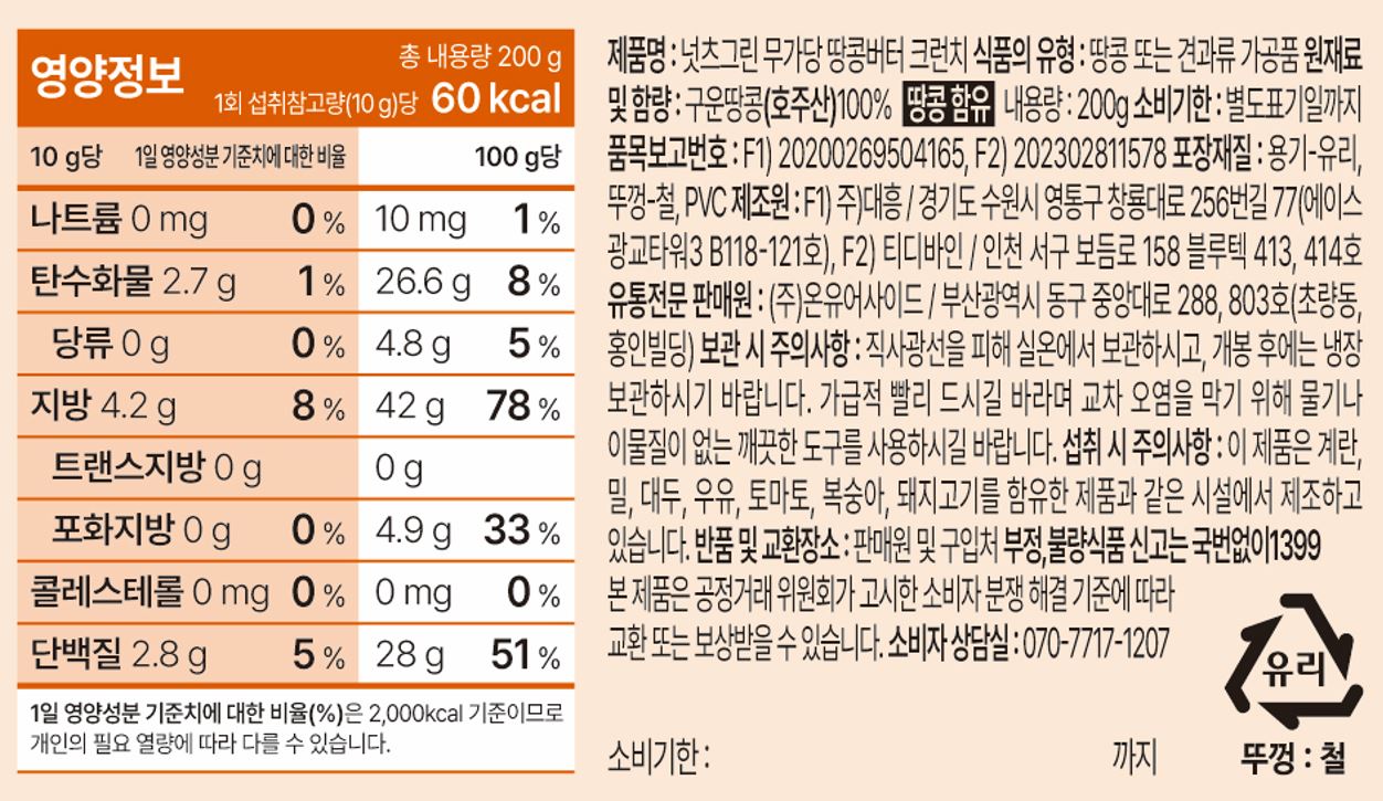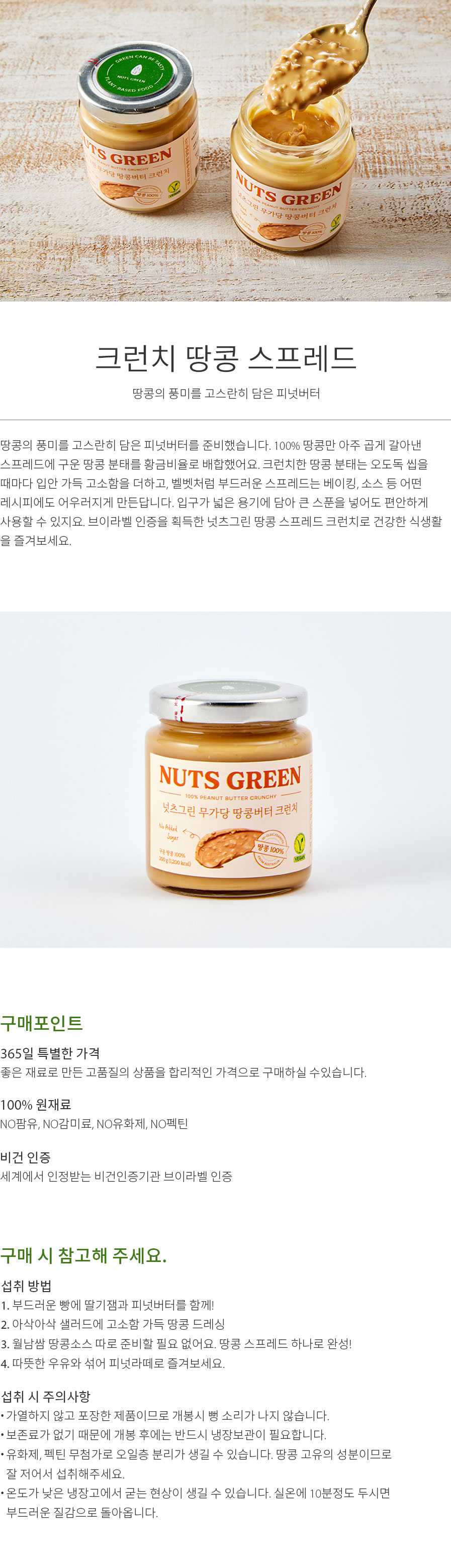 첨가물 없이 100% 땅콩만 아주 곱게 갈아낸 제품으로 묽은 질감입니다.