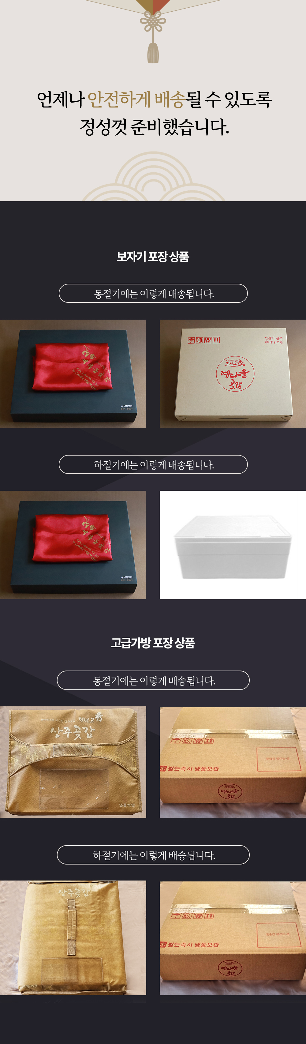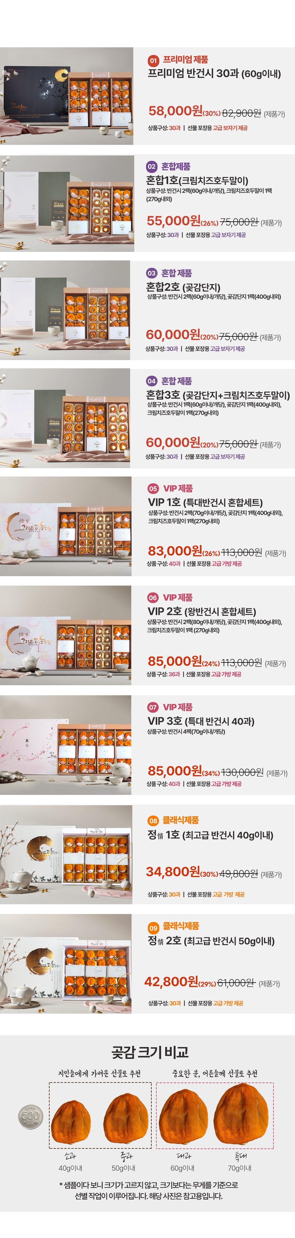 1. 프리미엄 반건시 30과 (대과, 60g이내) 2. 혼합1호 (반건시 대과(60g이내) 20과, 크림치즈호두말이 10개입(270g내외)) 3. 혼합2호 (반건시 대과(60g이내) 20과, 곶감단지 10개입(400g내외)) 4. 혼합3호 (반건시 대과(60g이내) 10과, 곶감단지 10개입(400g내외), 크림치즈호두말이 10개입(270g내외)) 5. VIP 1호 (특대 반건시(70g이내) 20과, 곶감단지 10개입(400g내외), 크림치즈호두말이 10개입(270g내외)) 6. VIP 2호 (왕반건시(80g이내) 16과, 곶감단지 10개입(400g내외), 크림치즈호두말이 10개입(270g내외)) 7. VIP 3호 (특대 반건시 70g이내) 40과 8. 정1호 (반건시 소과(40g이내) 30과) 9. 정2호 (반건시 중과(50g이내) 30과)